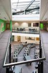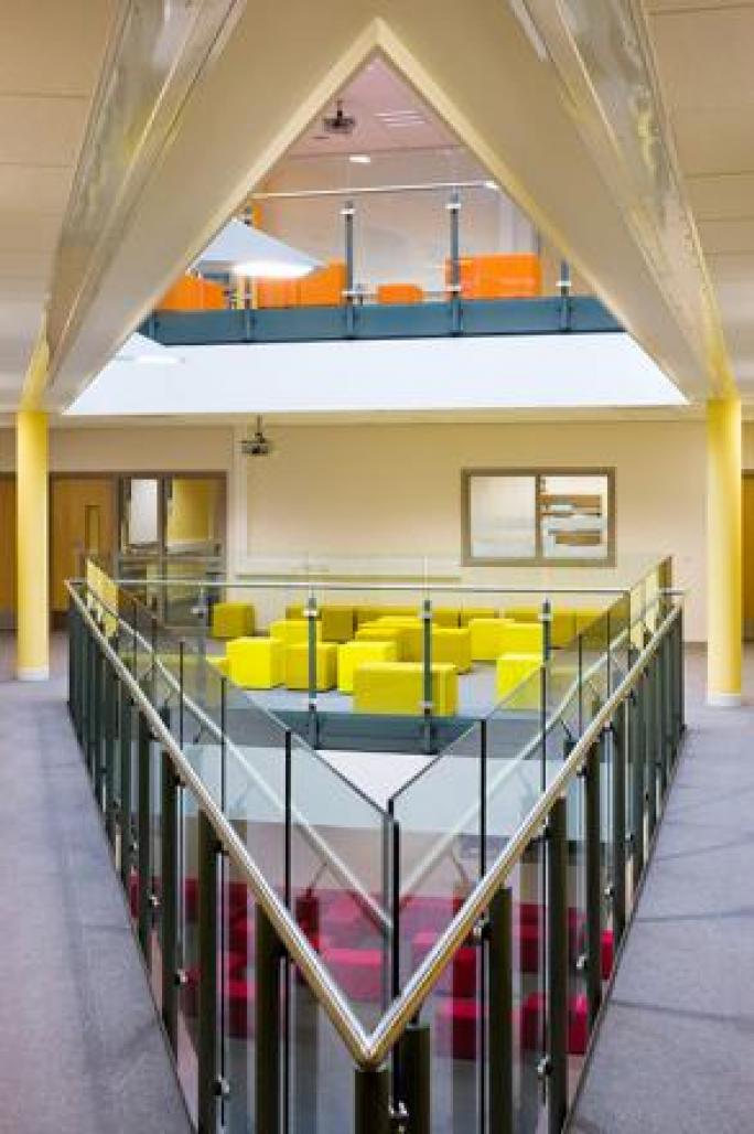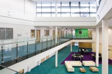 The building is organised around a wide street orientated north/south with the main entrance at the south end into an atrium space around which are grouped the Multi-Faith centre, the Library and Business Studies classrooms. Teaching spaces generally are grouped into two wings for general teaching {including Business Studies} and one for practical subjects. The triangular plan of the wings creates a striking diagonal geometry which unifies the whole plan. Hall and dining open off the west side of the street and this whole area produces varied spaces for circulation, socialising, ICT, private study and dining. Sports facilities are at the south end of the building giving good direct access to the playing fields and also the potential for direct entrance from the adjacent public car park.