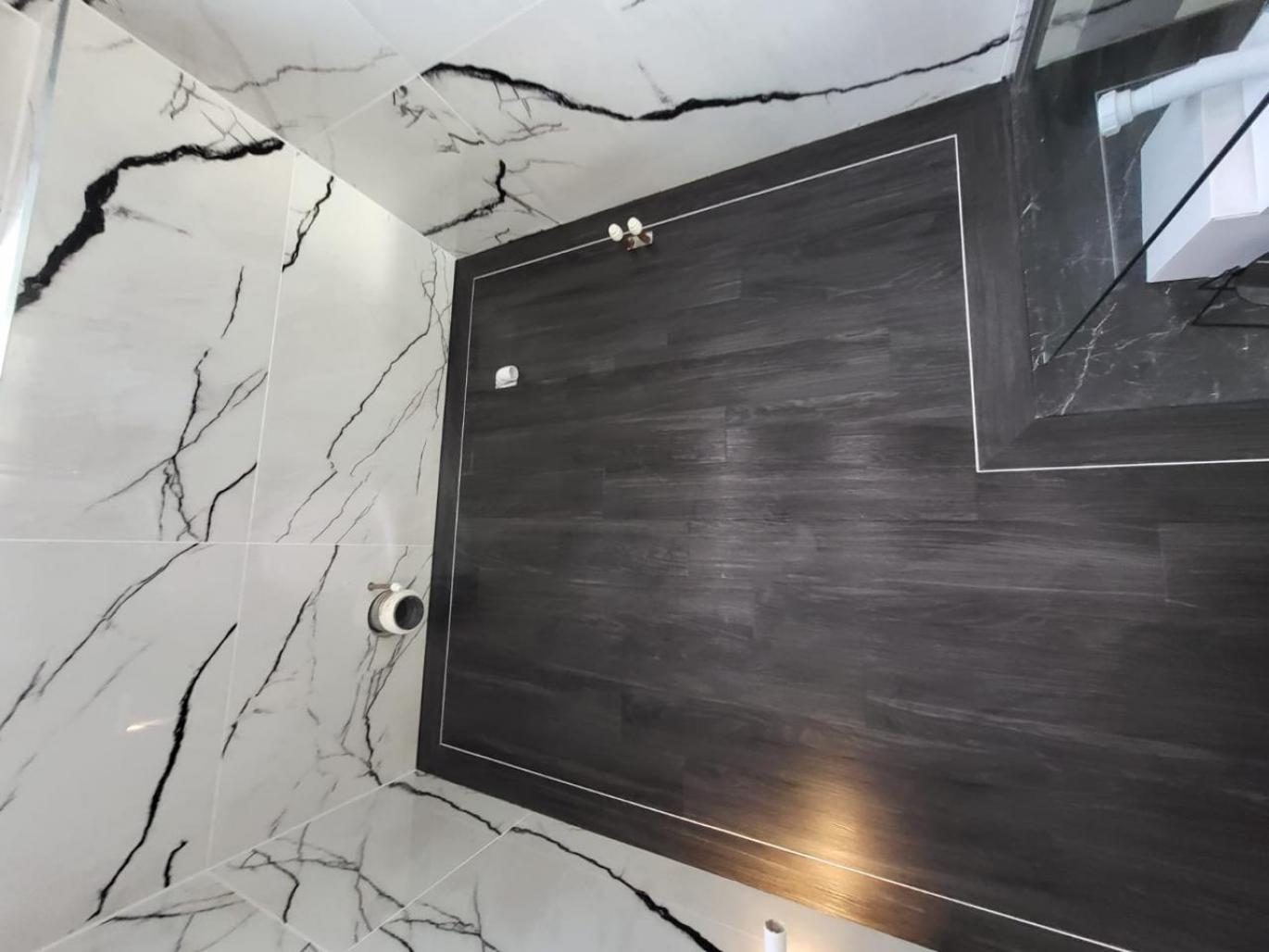 Elegance, simplicity, and function were the key words when undertaking a bathroom project. From conception all the way to completion, it was intended that the space felt so clean, luxurious, and timeless that a conversation could never be had about practicality or durability. Making it go for a high-end look without the effort is different from choosing the traditional high-maintenance materials. Thus, to make this happen, LVT was selected for the floor due to its superior water resistance, abrasion resistance, and ease of maintenance for everyday use. The straight lay brings calmness and order to ensure keen and smooth first-floor flow through the bathroom. To add a little flair, there is a feature border that visually creates a striking frame for the floor. This small but impactful detail enriches the space geometry while subtly demarcating zones within the bathroom, enhancing spatial awareness. The walls are clad with huge marble-effect tiles complementing the feel, reflecting natural light, and creating a sense of spaciousness. Minimalist black fittings and clear glass enclosures were favored to keep things visually open and present a stark contrast to the wall's lighter tones and the flooring's rich finish. Lighting is probably the most figuring element when it comes to design, giving emphasis to the textures and finishes while making sure the area is well-lit and welcoming. In brief, this whole arrangement wonders with relish in providing an elegant look, practical approach, and space to accommodate modern living needs effortlessly.