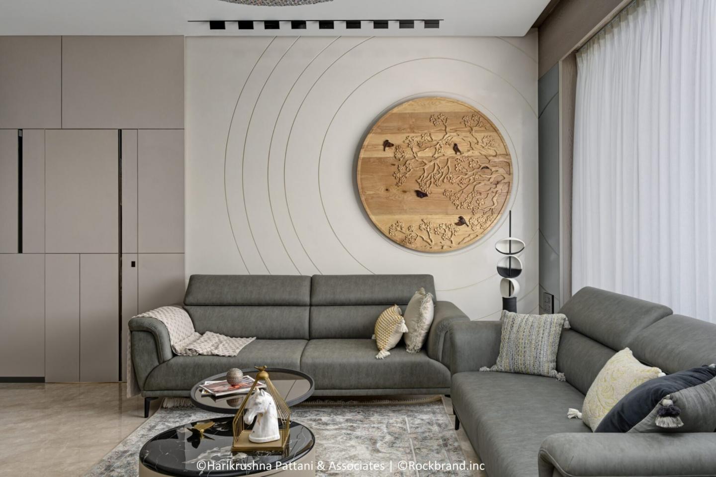 Located in Sharanya Skyvue, Thaltej, Ahmedabad, this 4BHK apartment by Harikrushna Pattani & Associates redefines modern minimalism with a poetic sense of calm. Spanning 2000 sq. ft., the home was envisioned by the client as a monochromatic, grey-toned sanctuary that felt expansive, elegant, and serene — anchored by a grand chandelier as the visual centerpiece.