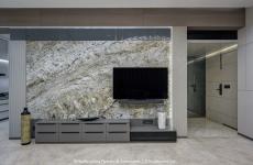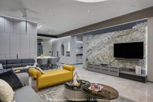 The entry vestibule sets a spiritual tone with a striking Ganpati artwork and sleek built-ins that maximize utility while maintaining visual simplicity. As one transitions into the drawing room, the scale opens up, and the design’s intentional restraint becomes evident. A dazzling crystal chandelier commands attention, adding drama to the subtle grey surroundings. A single-slab stone TV unit and a custom-crafted wooden art piece balance opulence with understated texture.