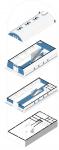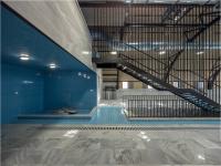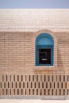 Access to the building is through a central axis paved with turquoise tiles that extend inward from the southern façade. Midway along the axis, a staircase with matching turquoise treads leads to a mezzanine level, which is also finished in the same tile. The tiling continues up the rear wall, visually pulling the turquoise color through the depth of the space. At the ground level, the axis culminates in a turquoise basin used for washing large cooking pots, surrounded by walls clad in the same tile. The interior surfaces of the cubic skylights are also tiled in turquoise, further reinforcing the prominence of the central spine.