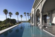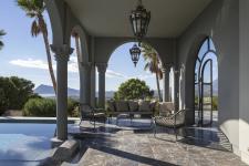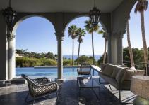 The infinity pool blends visually with the Mediterranean horizon, while the terrace is conceived as a shaded outdoor lounge, complete with carved capital columns and symmetrical arches. Surrounded by native vegetation, this space becomes a natural extension of the interior — ideal for watching the sunset or enjoying moments of relaxation.