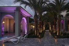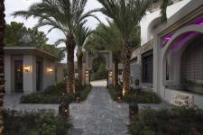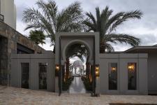 From the main entrance, the visitor is greeted by a series of arches inspired by Moroccan architecture, framed by tall palm trees and geometric symmetry that invites exploration of both interior and exterior spaces. The monumental entrance marks the visual axis leading toward a central white pavilion, serving as both a focal point and symbolic reference.
