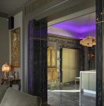 The interior design reinforces the project’s elegant identity. Materials such as veined black marble, golden finishes, and mirrored panels provide a sophisticated ambiance without becoming ostentatious. Indirect LED lighting in violet tones adds a contemporary and theatrical touch, transforming the mood as night falls.