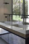 Inside, the design embraces a calm, refined minimalism. The bathroom showcases a custom-made floating vanity with carved sinks and matte black fixtures, placed in front of a large window that visually connects the space to the garden beyond. Natural stone, textured tiles, and clean-lined furniture all contribute to a sense of tranquility and spatial purity.