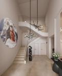 The entrance hall sets the tone: a soaring double-height space with an abstract black chandelier installation and fluid staircase framed by brass balustrades. A large, hyperrealist portrait in a circular frame dominates one wall, bringing both personality and softness to the architectural symmetry. Artistic accents, such as the black sculptural totem and asymmetrical console table, complement the architectural geometry with emotional contrast.