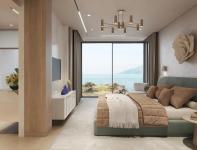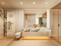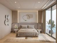 The bedrooms are studies in calm luxury. Neutral palettes in sand, stone, and ivory are paired with tactile materials such as velvet, leather, and stonewashed linens. Floating beds, inset lighting, and concealed wardrobes enhance the sense of minimalism, while every detail — from the custom bedside tables to the recessed curtain rails — speaks of thoughtful design.