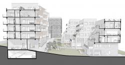 The design intention stems from two primary concerns: first, to mitigate the negative acoustic impact of the adjacent main road; and second, to preserve the sense of neighborhood and street life in an increasingly dense urban context.