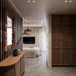 A signature feature of NH House is the double-height entrance framed by tropical vegetation and a striking wooden door that sets the tone for the earthy, sophisticated ambiance inside. The furniture is custom-selected for both comfort and sculptural form, enhancing the atmosphere of understated luxury.