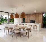 The layout is fluid, organized around a central open-plan living space that connects the lounge, dining area, and kitchen. Large sliding glass panels offer direct access to the garden and pool, allowing light and greenery to become an integral part of the interior. The interiors are dominated by neutral tones and textures, with warm wood, woven elements, and stone finishes that echo the natural surroundings.