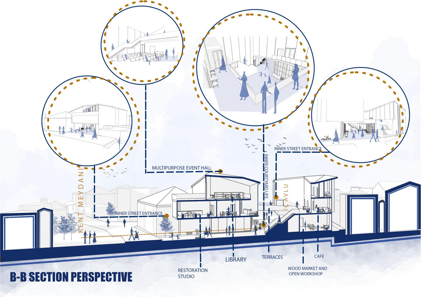 The ground floor was predominantly allocated to public uses, reinforced by the inner street system that links the building with the square and strengthens areas for social interaction. On this level, workshops, timber market, and foyer spaces were positioned as accessible public zones. The upper floors accommodate the restoration support unit, carpentry workshop, and educational spaces, maintaining a clear vertical programmatic hierarchy.
