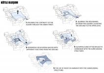 The project aims to establish a strong spatial relationship with At Arabacılar Square, carrying this significant layer of urban memory into the architectural body itself. In this context, the ground floor is designed entirely as a public layer, where an inner street and courtyard configuration has been integrated into the design to maintain the continuity of the square. The building mass is fragmented in accordance with the surrounding parcel-based urban fabric, and the volumes are shaped by multiple levels to enrich the spatial experience.
