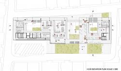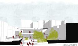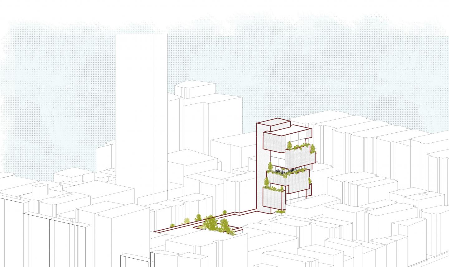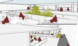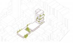 THE FIRST VOLUME IS A HORIZONTAL BASE DIRECTLY CONNECTED TO THE GROUND AND INTEGRATED WITH GARDENS. THIS BASE HOUSES THE EDUCATIONAL KITCHENS OF THE CULINARY ARTS INSTITUTE, AS WELL AS CAFES, RESTAURANTS, AND A TV STUDIO. IT FEATURES GARDENS AND TERRACES THAT ESTABLISH A STRONG CONNECTION WITH THE CITY AND ITS USERS.