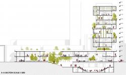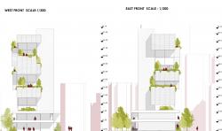 THE SECOND VOLUME IS A VERTICAL, PROMINENTLY RISING STRUCTURE THAT DEFINES ITSELF AS AN AGRICULTURAL RESEARCH INSTITUTE. IT IS CLOSED OFF TO THE PUBLIC AND COMPRISES OFFICES AND A CAFETERIA. THE AGRICULTURAL PRODUCTS PRODUCED WITHIN THIS VERTICAL VOLUME CAN BE UTILIZED IN THE EDUCATIONAL KITCHENS LOCATED IN THE BASE.
