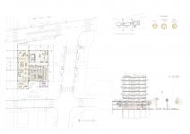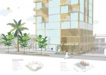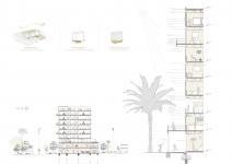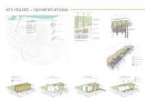 The equipment has a direct relationship with the houses since heights are taken into account to have a better human scale. The hotel is eight stories high, and the ground floor is flexible, with walk-in closets, showers, and space to accommodate more people on the ground floor, making it resilient in the event of another catastrophe.