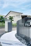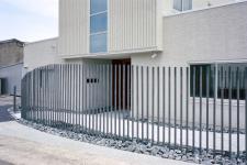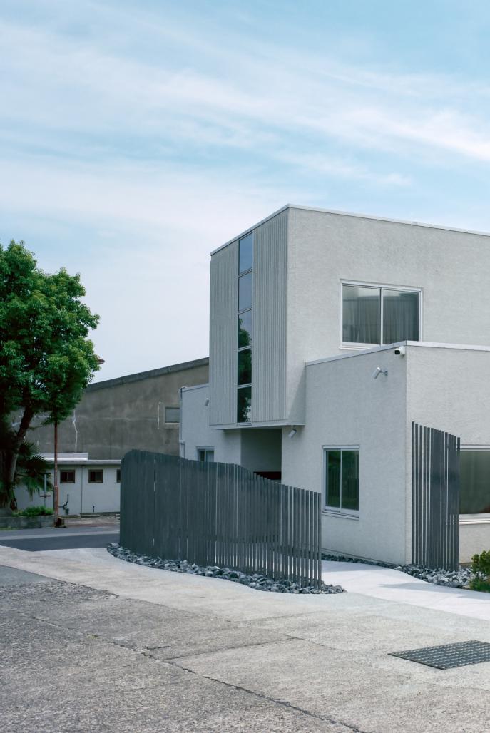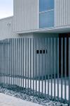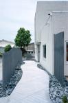 The approach is paved with white-colored natural stone. When sunlight casts on the louvers, their shadows intersect with the stone joints, highlighting gradual changes over time.