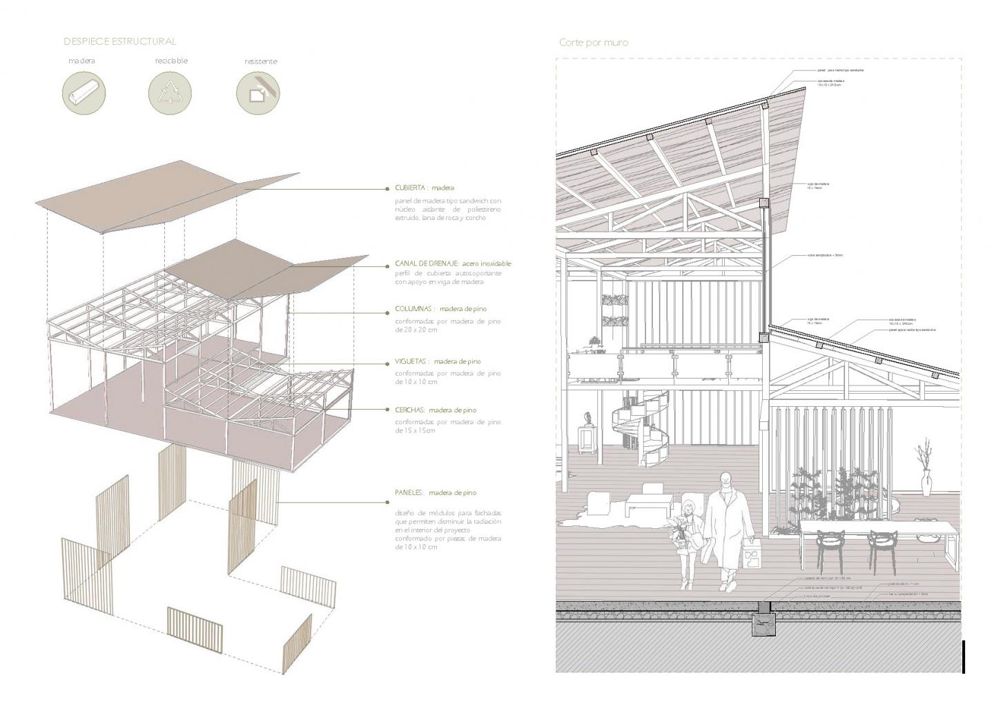 It was decided to use a wooden structure because it is the most environmentally friendly, and also allows its reuse if needed, columns, beams and pine wood joists are proposed, also a treatment on facades where the sun hits more strength, reason why partitions of horizontal slats are considered.