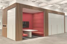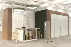 Following preliminary assessments, the team adopted a holistic approach to address several physical challenges such as lack of acoustic comfort in the open office layout, insufficient individual and shared working areas, the need for meeting rooms and social spaces, and inadequate lighting and storage. In addition to integrating modular space solutions like mini meeting booths and phone cabins, acoustic comfort was improved with felt panels to enhance the overall interior environment.
