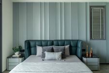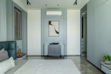 Then comes the third bedroom, dipped entirely in serene shades of blue. The bed-back features flute detailing with a gentle arch—a nod to the curvilinear language found throughout the home. A matching blue leather bed and brass-based side tables echo the warmth of the dining space, creating cohesion while allowing this room to have its own personality.