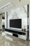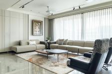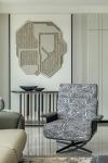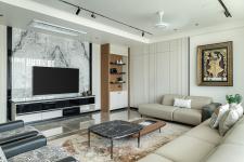 The living area transforms into a cozy media zone—a direct response to the client’s lifestyle. A recliner sofa anchors the space, while soft beige tones wrap around the walls, furniture, and rug, exuding calm and cohesiveness. Accent chairs, with their bold patterns, add a graphic punch, breaking the monotony with effortless style. A sculptural art piece paired with fluted panels offers a sense of curated minimalism, while the touch of marble elevates the luxurious undertone. Bathed in natural light, the room feels grounded yet luminous.
