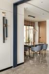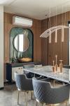 Flowing into the dining area, warmth takes over. Wood-paneled walls, enriched with subtle brass inlays, carry an understated sophistication. These brass accents reappear on the legs of the dining chairs, tying the palette together. Just opposite, a compact brass wash basin crowned with a circular mirror and green marble backdrop becomes a statement of compact elegance.