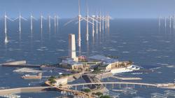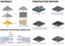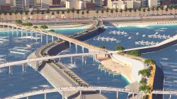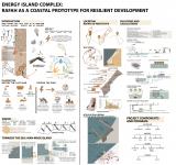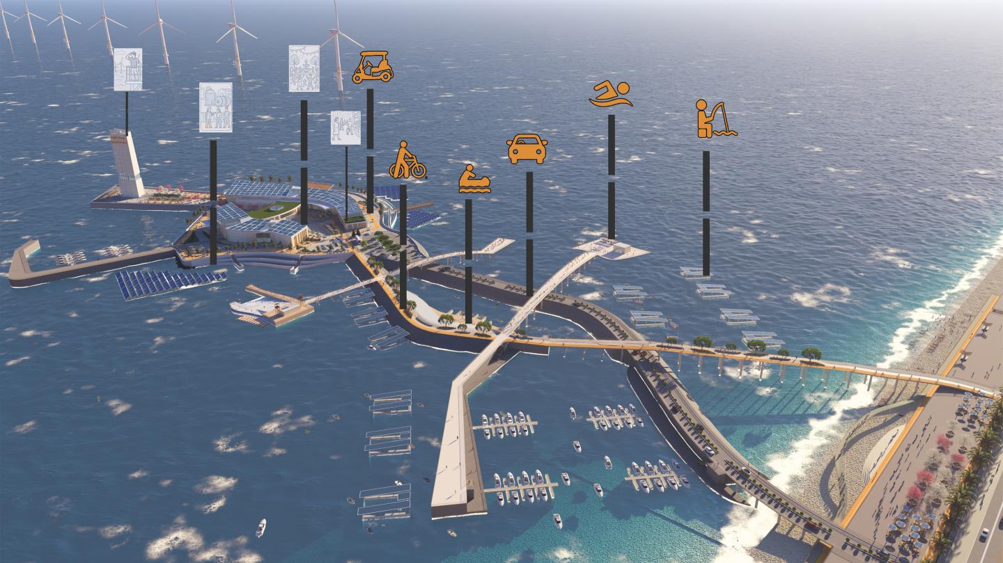 The technical foundation of the Energy Island Complex is built on an integrated system of renewable energy sources that respond directly to Rafah’s environmental conditions. The project combines 40 offshore wind turbines, over 500 solar panels distributed across rooftops, floating structures, and landscape surfaces, along with wave energy converters placed around the island. Together, these systems are designed to generate approximately 0.7 terawatt-hours annually, supplying the energy needed to operate a large-scale reverse osmosis desalination plant capable of producing 120,000 cubic meters of fresh water per day. The island’s infrastructure also supports vertical farming systems distributed across building courtyards and rooftops, and aquaculture ponds shaded by solar-integrated net structures to support food production and marine biodiversity. Structurally, the island is anchored using prefabricated caisson foundations, filled with recycled war rubble and sand to minimize environmental impact and reinforce resilience. Buildings use recycled concrete and sandblasted louvers to adapt to Gaza’s coastal climate, ensuring durability and passive environmental control. The project includes an "Energy Hub" that houses public spaces, educational labs, housing units, and workshops, while treated grey and black water is reused for irrigation. A multifunctional bridge connects the island to land, providing access for pedestrians, vehicles, and boats, and integrating floating recreational areas. Every component: energy, water, food, architecture, and mobility is designed to operate independently of external resources, making the project a scalable and adaptable model for post-conflict recovery and sustainable coastal development.