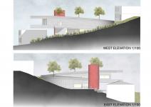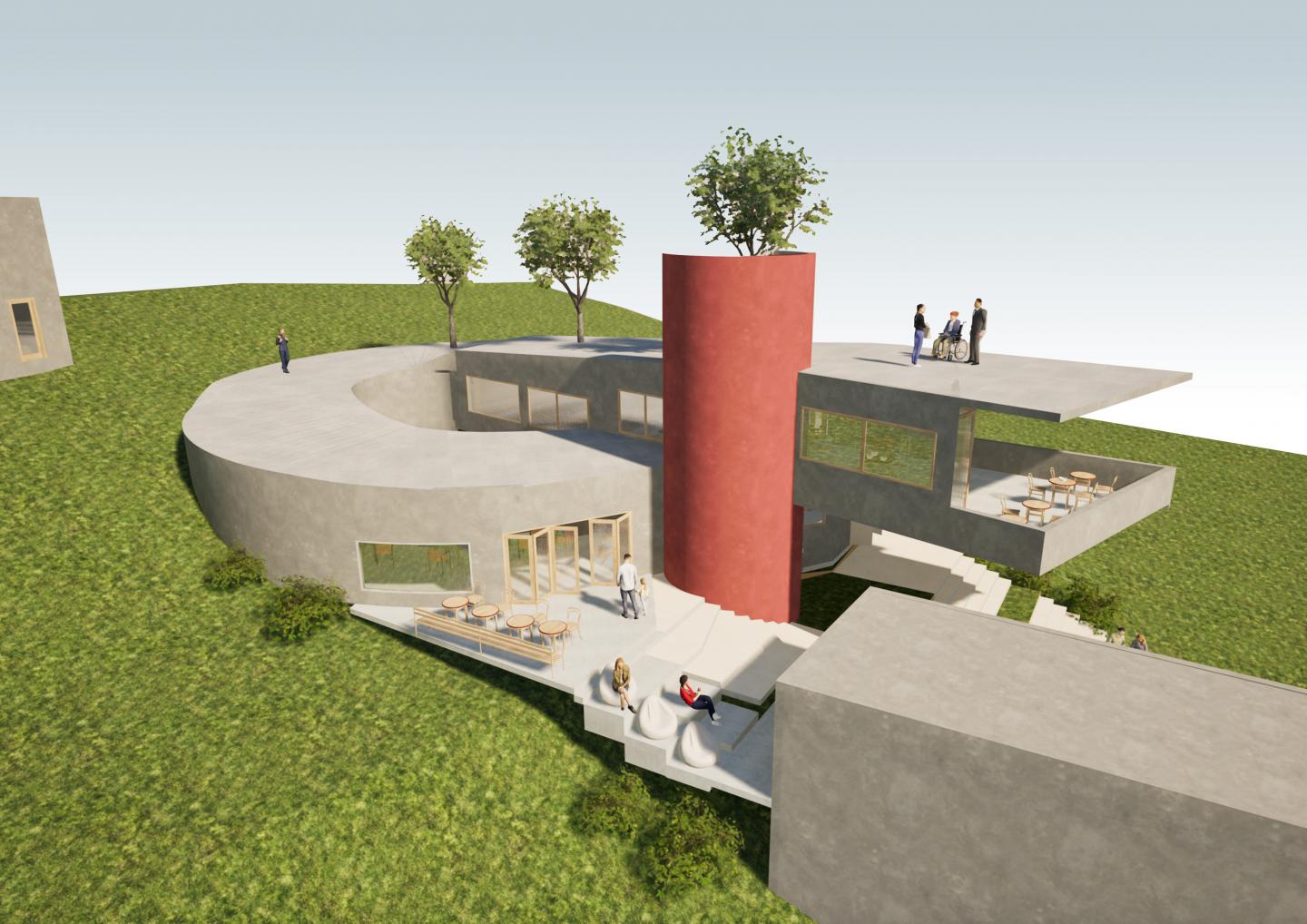 The structure uses a combination of reinforced concrete and steel systems to support the curvilinear geometries and cantilever surfaces. The sloping roof functions as a walkable terrace connected by integrated ramps and a cylindrical elevator shaft. There is an opportunity for unhindered circulation on all floors.