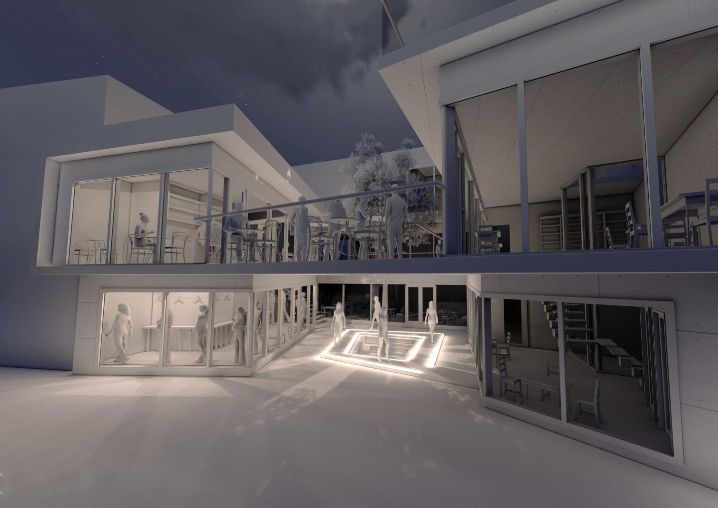 Night: Spaces close off, lighting transforms the courtyard into a glowing urban stage.