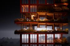 Located in the fast-evolving urban fabric of Hyderabad, this project redefines the relationship between architecture, greenery, and lifestyle. Combining commercial space, serviced apartments, and community-focused amenity zones, the building introduces a new vertical typology that is both functional and experientially rich. With its terracotta façade and integrated landscape design, it creates a strong identity while addressing the realities of climate, density, and user well-being.