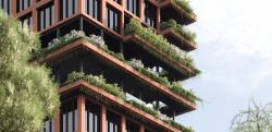 Its color and texture change subtly with the light, giving the building a dynamic appearance through the day. Against the greenery of the terraces and the dark glazing of the façade, the terracotta creates a balanced and visually rich contrast.
