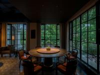Rustic timber, brick, and stone define the structure. Furniture and tableware celebrate raw craftsmanship and organic textures, evoking a timeless aura. This earthy narrative is enveloped by dignified architecture and floor-to-ceiling windows framing lush greenery. Poetic grace and profound history converge into an experiential crescendo.