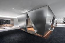The journey begins at the elevator lobby, where an inverted pyramid ceiling creates a dramatic welcome. This striking architectural feature sets the tone for an experience that challenges traditional office design paradigms. Rather than simply displaying products, Karv One has crafted a narrative that guides visitors through various spatial experiences.