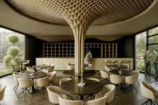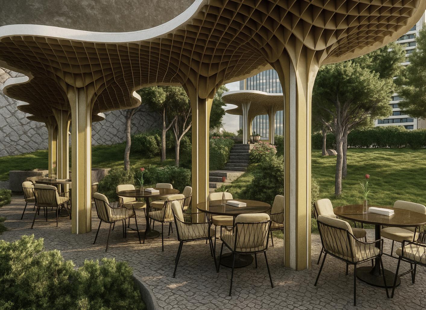 The careful organization of pathways, circulation routes, and resting points ensures that visitors move through the project in a rhythm aligned with the sequence of these vertical elements. Walking and pausing become an orchestrated experience, echoing the flow of water and the pauses of droplets in motion. In this way, Abshar Restaurant emerges as more than just a dining space: it becomes a landscape of encounter, a stage where the city’s pulse meets the stillness of nature. The result is an environment that is at once vibrant and serene, urban yet natural, offering an architectural narrative of balance and coexistence.