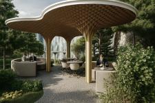 The main design concept originates from the simplest yet most essential component of a waterfall: the water droplet. This elemental form, associated with purity, fluidity, and continuity, was first explored in two-dimensional studies and later transformed into vertical, three-dimensional structures that rise throughout the site. These dynamic forms, reminiscent of abstract trees or organic sculptures, not only provide necessary functions such as shade, shelter, and orientation, but also introduce a strong symbolic presence of nature within the architectural composition.