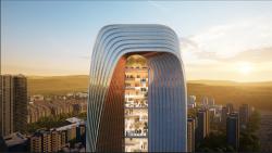 The design positions the office tower at the street corner, rotated 45 degrees to align with the landscape axis. The architectural form outlines a three-dimensional Möbius loop, connecting the surrounding mountains and water.The façade features a gradient interplay of copper-toned aluminum lines and Low-E glass, evoking the image of sunset reflections on the river.