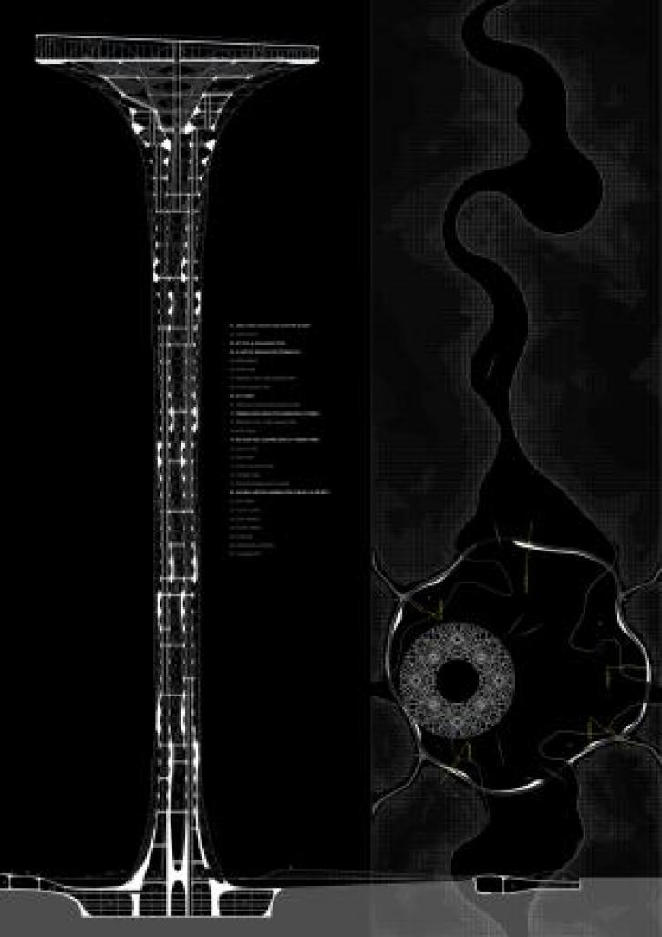 The sharp temperature change of land and air in Cheong Na District causes various dew points, and this creates a 450m high-mist in the city when it touches the water on the top of the tower. The tower makes a new atmosphere; a huge beacon formed by the dispersion of fog particles to the artificial lights project on them. This extraordinary urban scenery becomes a new media shining human festivals, like waterworks, instead of fireworks.
