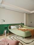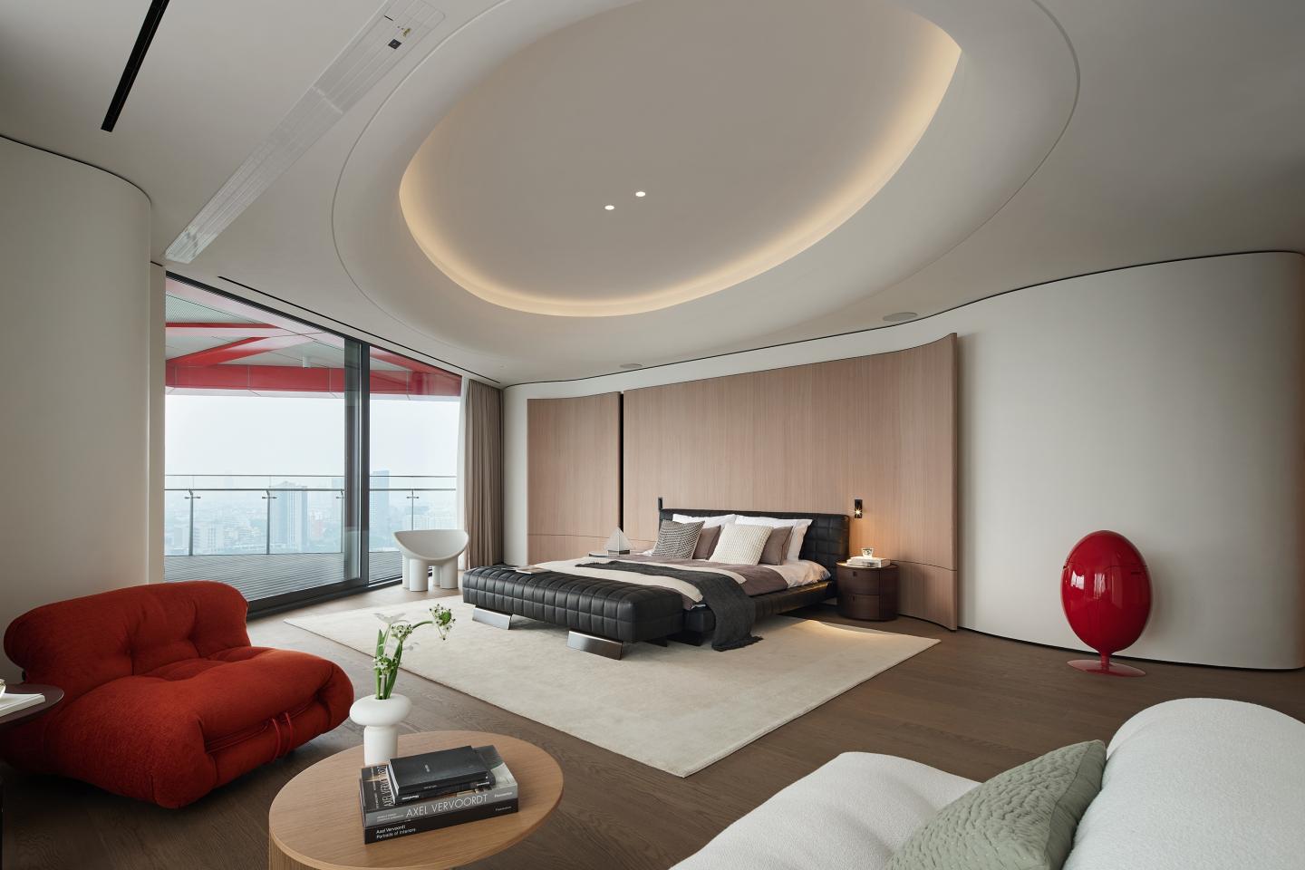 The master bedroom is located on the southwest side of the residence, facing the secondary bedrooms across the space. The design honors the hostesss love for nature and art, using soft forms to soften the sharp edges of the building's original structure and create a warm, serene atmosphere for rest. The "10