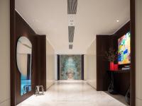 The entry foyer is slightly recessed, embodying the family's modest demeanor while carrying the auspicious meaning of gathering prosperity and positive energy. Upon entering, the marble inlay patterns in the entry corridor resemble layers of ocean waves surging toward golden sand, creating a flowing visual experience that naturally draws the eye to the foyer's focal feature. There, a full wall of Amazon Green luxury stone shimmers with vibrant hues, as if encapsulating the imagery of blue seas, clear skies, rocky reefs, and white clouds within the wall—infusing the space with a rich artistic atmosphere and refined texture. A recessed section and art displays in the middle of the corridor break the visual monotony of the walls, guiding movement and encouraging pauses throughout the space.
