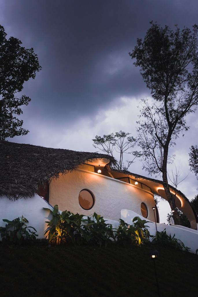 The organic form of the cabin was generated through parametric modeling, enabling the geometry to adapt directly to the steep contours and optimize surface area for material efficiency. This approach produced a sculptural ferrocement shell — thin yet structurally robust — that allowed the cabin to flow with the terrain rather than impose upon it. The shell is finished with breathable mud plaster, ensuring thermal comfort and tactile richness, while the locally sourced thatch roof softens the silhouette and integrates the architecture into the plantation landscape.