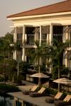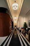The public spaces build on the monochromatic palette of the suites while introducing their own distinctive flavour. The speciality restaurant, with deep red walls and Art Deco motifs, offers an intimate dining experience reminiscent of a modern jazz club. On the contrary, the all-day dining area, with its light-filled verandah overlooking the pool, features grey terrazzo flooring with inlays of Jaipur green marble.