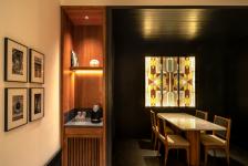 Studio Lotus’ design for the facade and interiors blends different eras, celebrating them through a refined material palette, subtle details, and architectural flourishes that channel Kolkata’s old-world charm. The design incorporates regional crafts and motifs, reimagining them to impart a distinct layer of Bengal’s cultural identity. A curved feature wall covered with hand-laid terracotta tiles evokes the intricate patterns of a Jamdani weave, setting the tone for the arrival experience. Guests are led through a voluminous barrel-vaulted corridor to a lounge designed with intimate booths, where local artist Jit Chowaudhury’s paintings—abstractions of Kolkata’s cityscapes in Jamdani-like strokes—add a layer of visual storytelling.