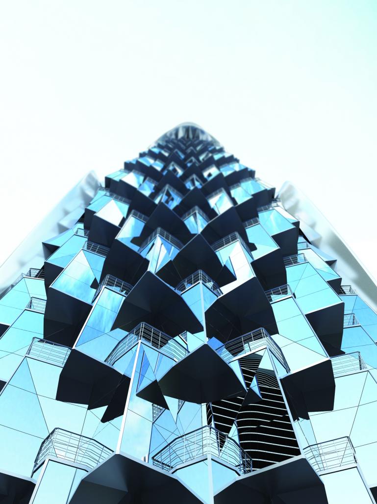 When the client requested modifications in 2014, the scheme was retouched to adjust the proportions, refine the façade articulation, and improve environmental and performance parameters (solar shading, material durability, thermal comfort). The retouched scheme expanded on the original metaphor, enhancing vertical rhythms and refining the interplay of shadow, light, and structure as the building interacts with the skyline.