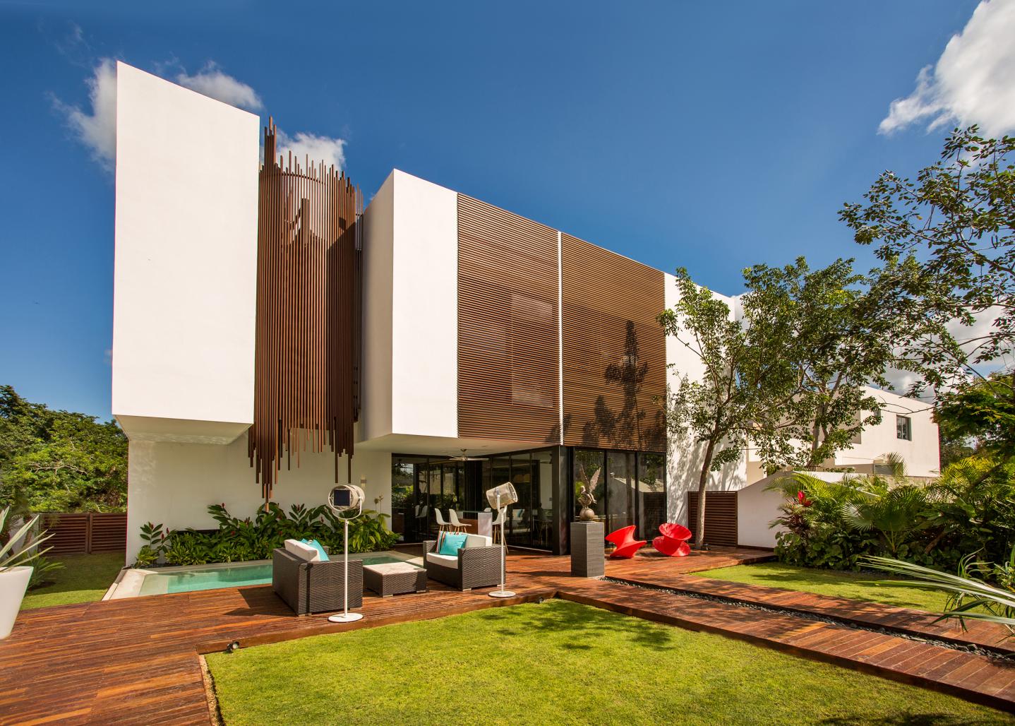 Inspired by the textile patterns of henequen fibers, a suspended triangular structure is created, covered with prefabricated concrete pieces made on site, an element that marks the access to the house and gives privacy to the social areas through an interior garden.