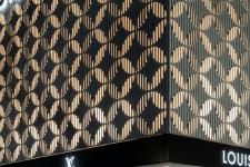The design is based on a single modular unit developed through an iterative process of modeling and fabrication. Each piece carries the reinterpretation of the Louis Vuitton flower, sculpted in relief and designed to interact with natural light. When assembled, the modules generate a continuous, rhythmic skin whose appearance transforms throughout the day as shadows deepen and highlights shift across the surface. This subtle movement imbues the façade with a living quality, turning a static architectural element into a dynamic and sensorial experience.