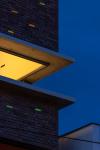 Facade material: Exposed terracotta brick, glass block, and wood