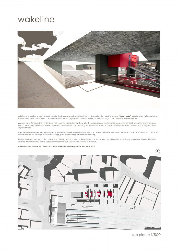 Urban transportation systems are not just tools for spatial connection; they also function as control mechanisms where people move, are observed, and exist within continuous flows. In this context, our project “wakeline”, developed around Basmane Metro Station, aims to break the mental “sleep mode” that ordinary metro use can create. It invites users to become aware of the space around them and their movement within it.