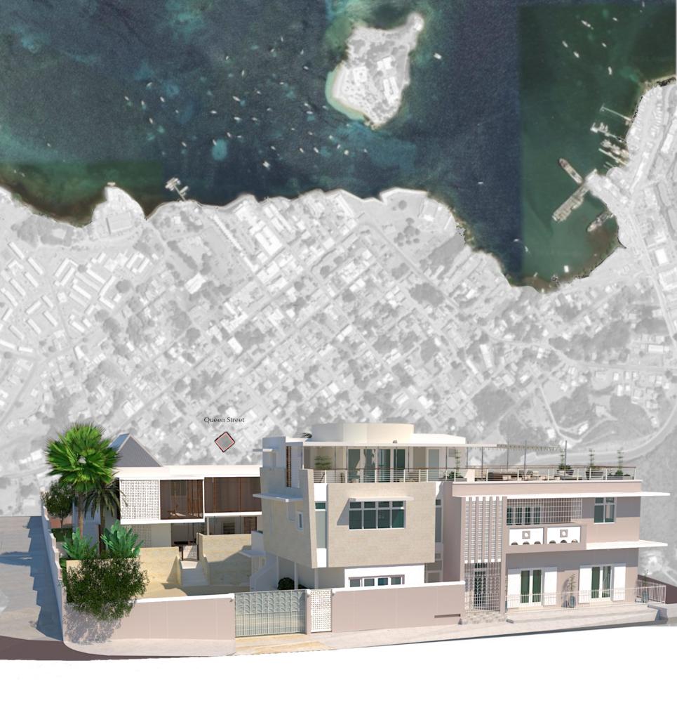 Bohio Rojas, located in the architectural historic control district of Christiansted, is built on a site comprised of three plots subdivided over time from its original lot on Queen Street. The planned town of Christiansted dates back to its founding in 1733. Presently, the site accommodates two historic wooden vernacular cottages dating from the 1850s, as well as a masonry 2-story Mid-century modern townhouse built in 1954 anchors the intersection of Queen & Market Streets. The 1779 Oxholm map indicates a large townhouse once existed on the site that spanned the original square lot. The owner is developing the site's 3 lots into a singular cohesive compound.