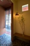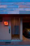 The entrance porch is decorated with a neon light shaped like a hippopotamus, the client's favorite animal. After passing through the "noren" curtain, visitors are greeted by an earthen floor in the entrance hall, featuring rounded pebbles selected by the client, and a lighting fixture made from stone.