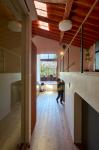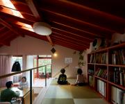 Ascending the stairs, one finds an epoxy terrazzo washstand and neon lighting featuring a hot spring symbol. From the hallway with the washstand, one can enjoy an unobstructed, clear view of the park ahead. In addition to such ingenious arrangements, the high, sloped cedar ceiling and plaster walls illuminated by uplights further enhance the sense of openness in this house.