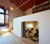 The tatami space, slightly elevated from the dining area, serves as the living space. Beneath the tatami area is the children's room, which can be closed off with blackboard doors featuring stone handles.